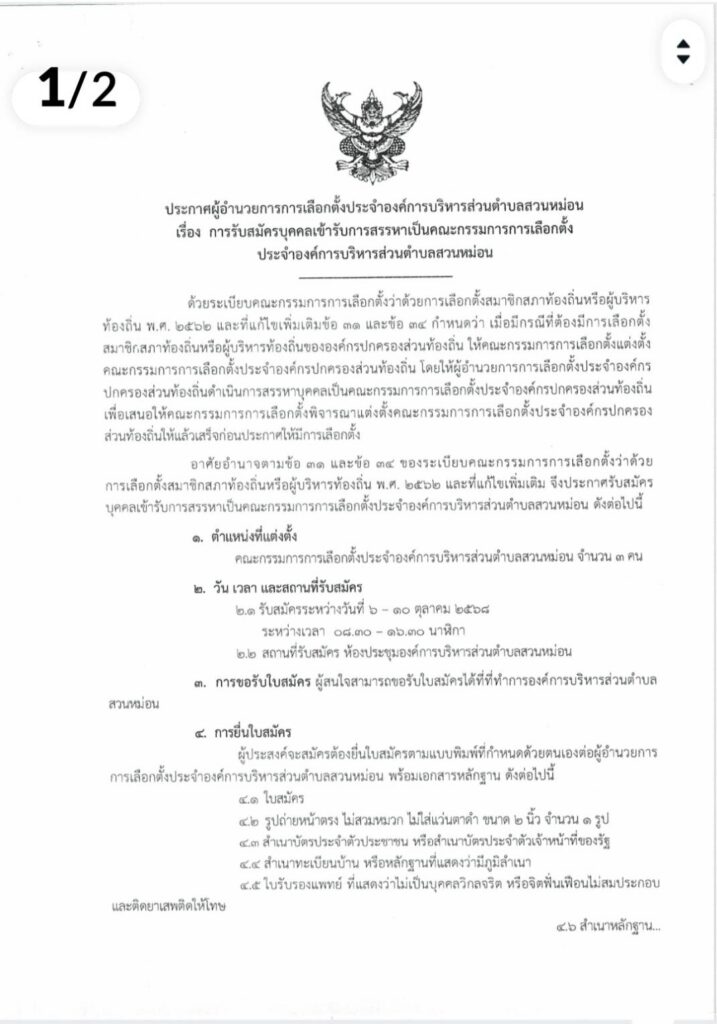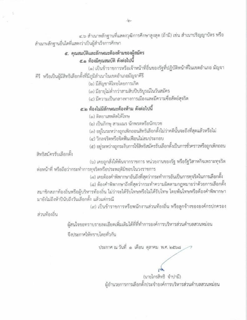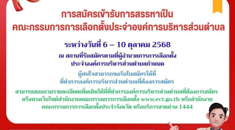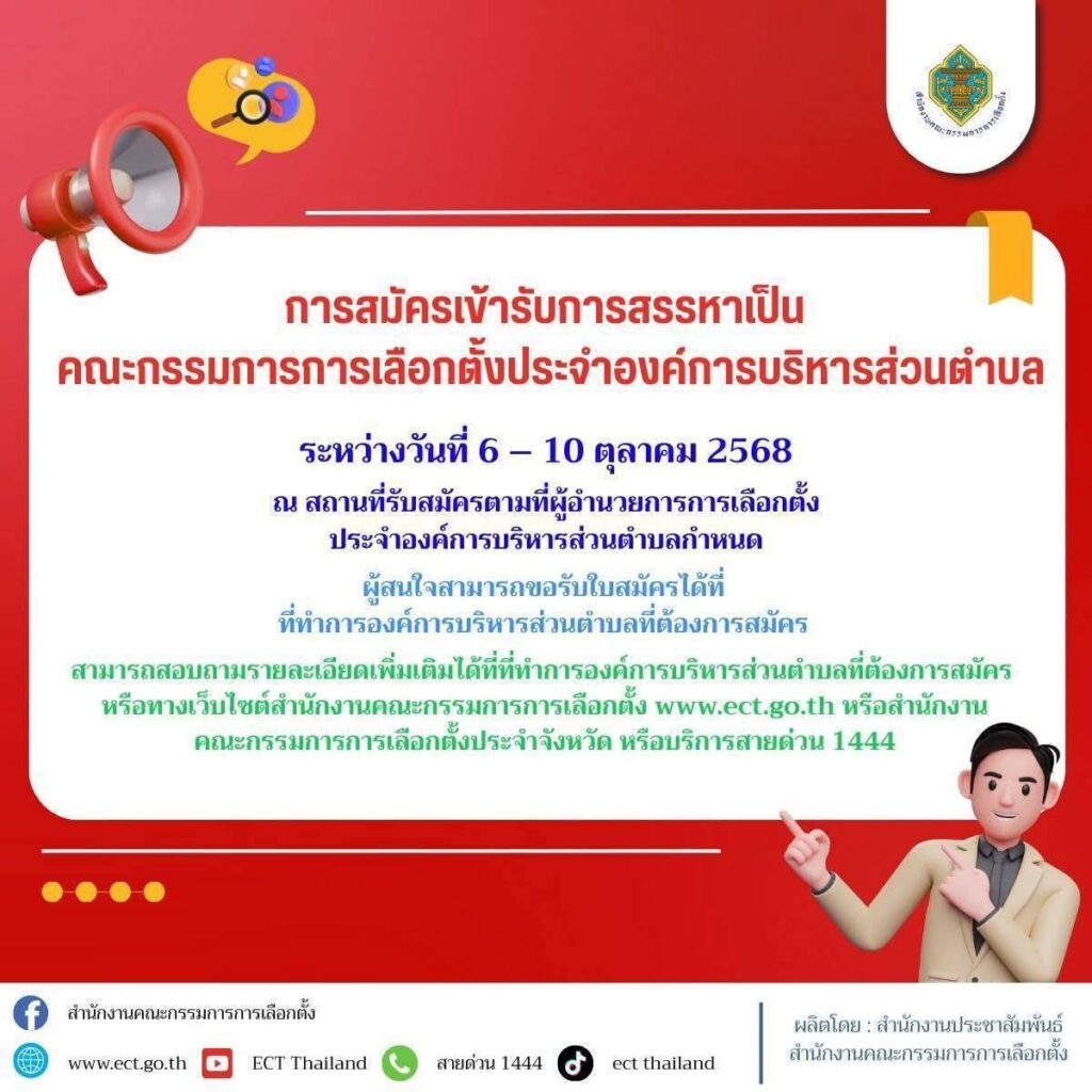 ระหว่างวันที่ 6 – 10 ตุลาคม 2568 ณ สถานที่รับสมัครตามที่ผู้อำนวยการการเลือกตั้งประจำองค์การบริหารส่วนตำบล ผู้สนใจสามารถขอรับใบสมัครได้ที่ที่ทำการองค์การบริหารส่วนตำบลที่ต้องการสมัคร